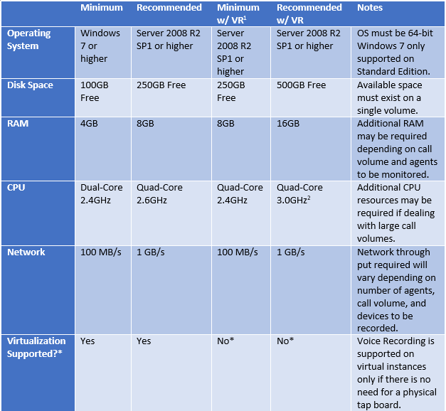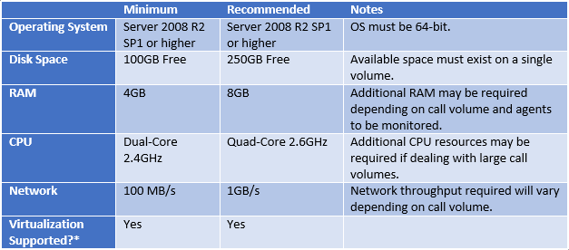 *= Virtualized servers are supported only if all devices to be recorded are IP-based. If any digital or analog handsets or trunks are to be recorded, a physical server will be required in order to accommodate installation of an audio capture board.