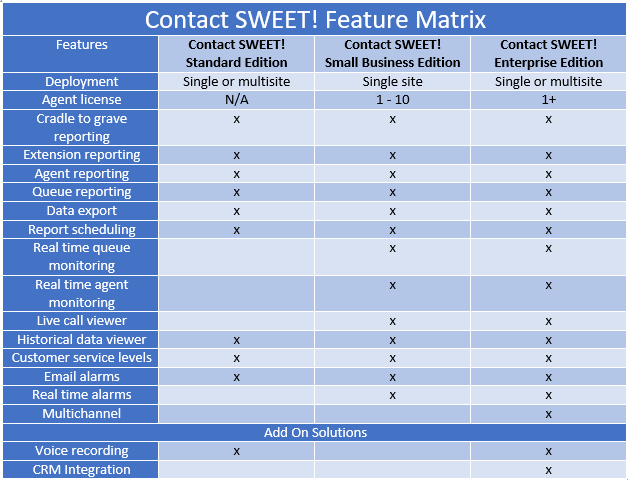 Contact SWEET! Standard Edition has been designed for the growing business, their owners and managers who need and easy to use call reporting solution to optimize business operations. Comprehensive historical reports for extensions, agents and groups, arm you with information you need to streamline business operations, make necessary changes to ultimately improve the way you are providing service to your customers in a cost effective and intuitive solution.